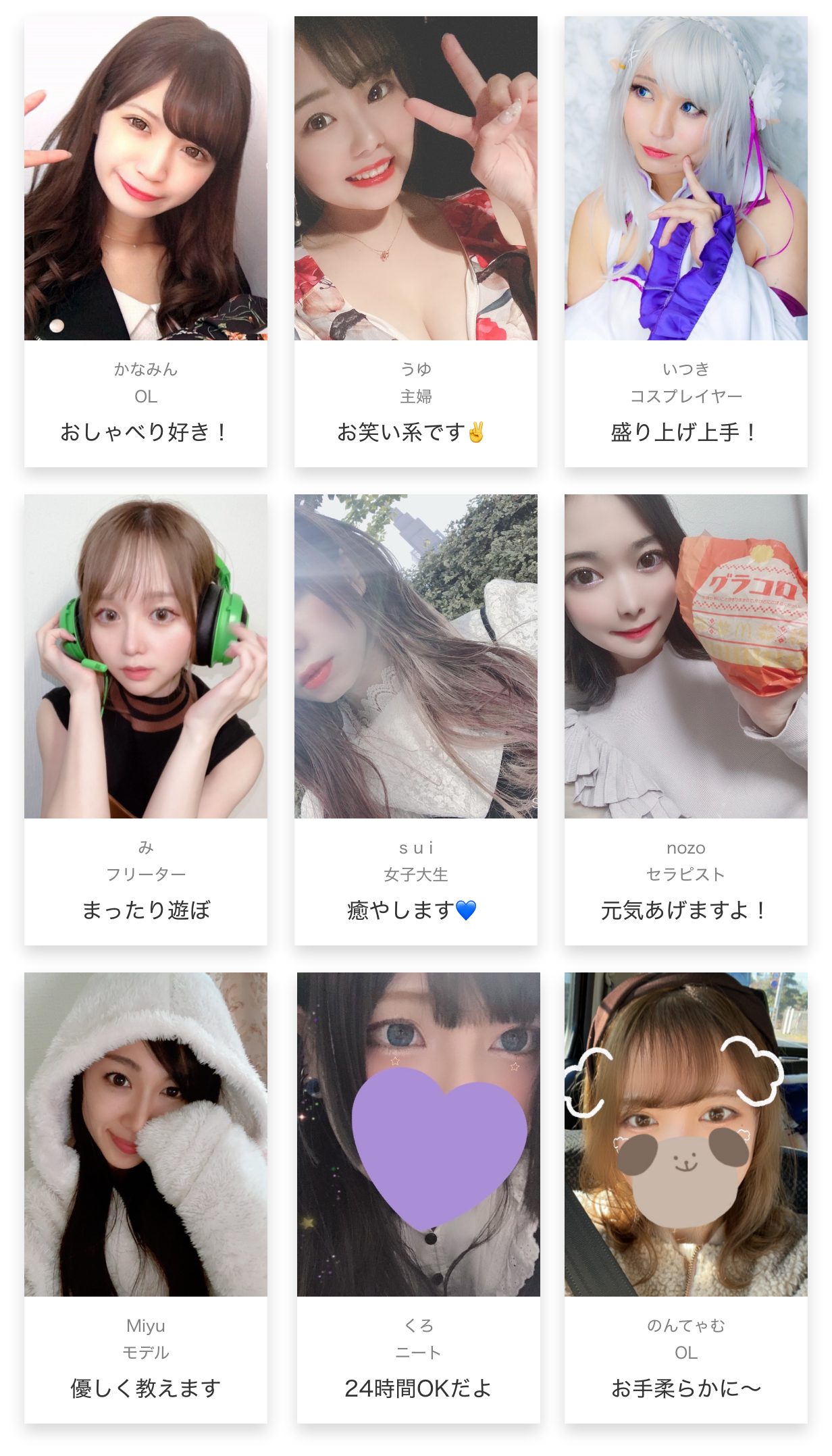 こんなご時世なので外出をなるべく避けて自宅で過ごすことが多くなっており、このサービスには助かっています。元々ゲームが好きなので、女性と話しながらできるのは素晴らしい。飲みに行くよりよっぽどコスパがいい癒やしだと思います。ゲーム好きの大人向けのサービスかもしれないですね。